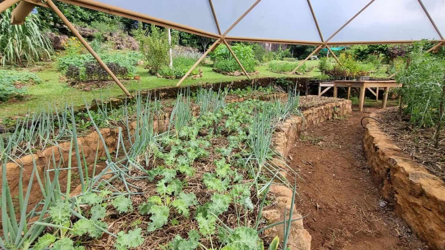 The farm covers roughly 2 acres, with over 600 fruit trees and syntropic agroforestry throughout the wider property. More than 1,700 native trees have been planted across the 170 acres. Residents receive a weekly basket of fresh organic produce. Hiking and biking trails run through the property along creek edges and through common areas.