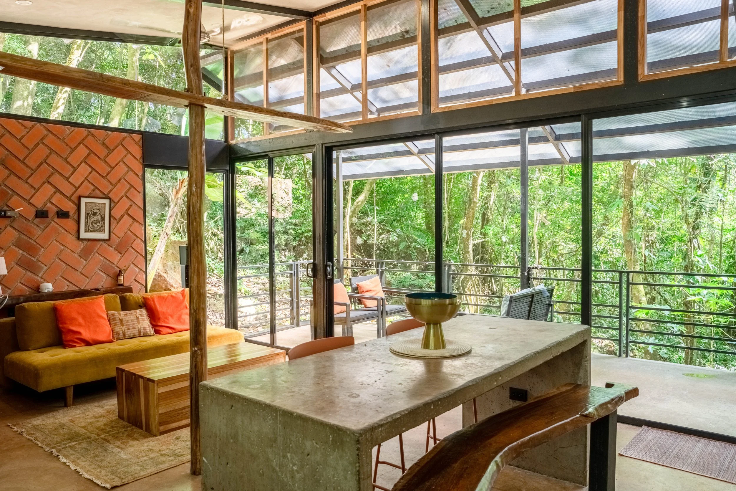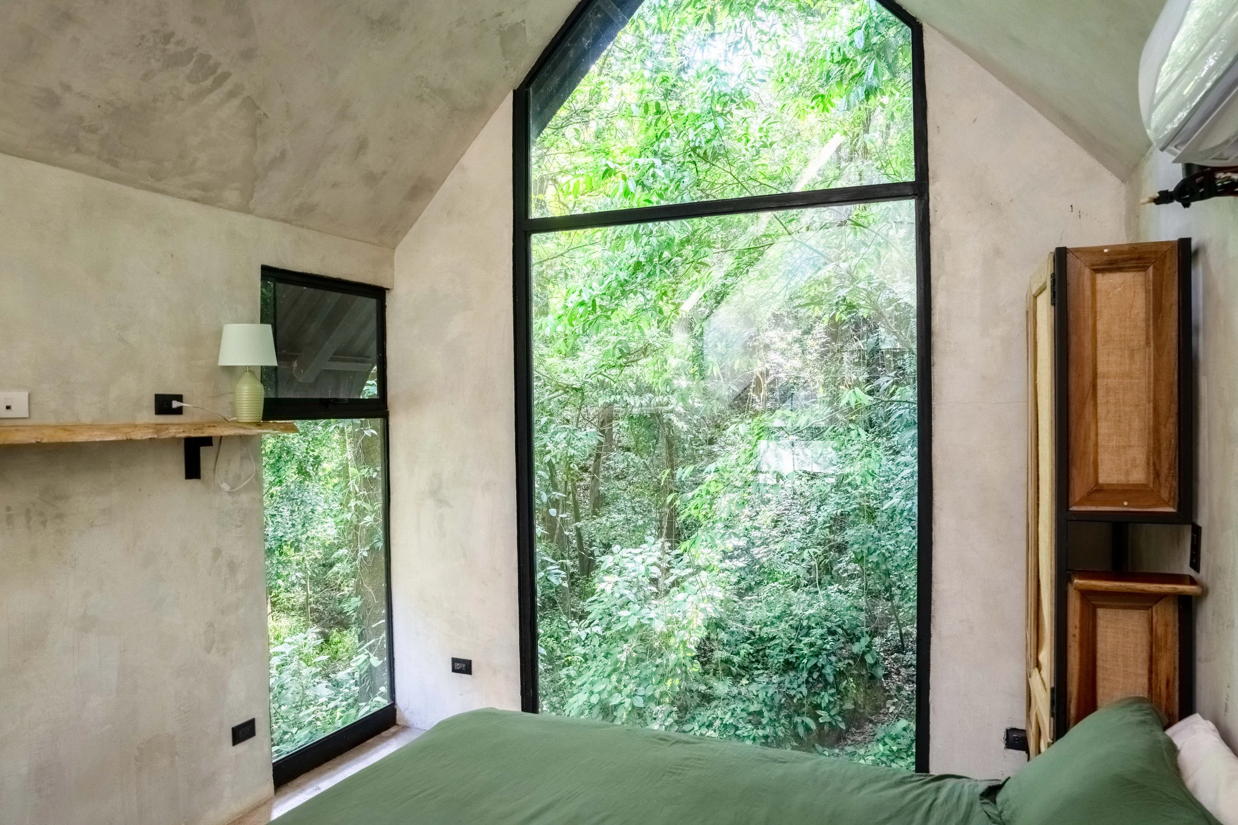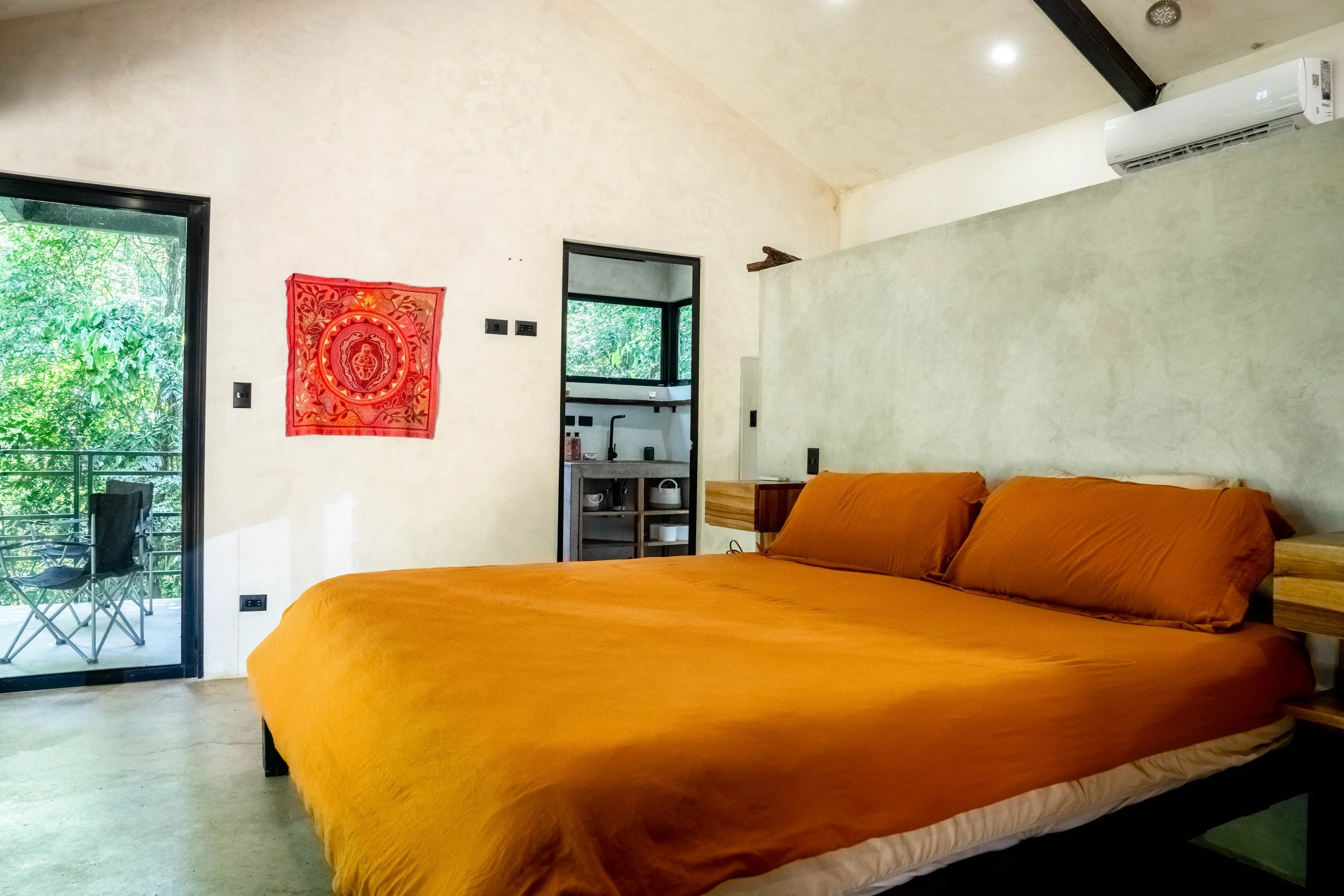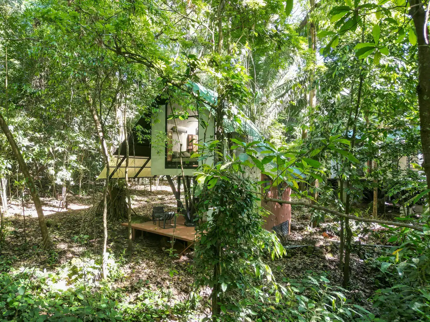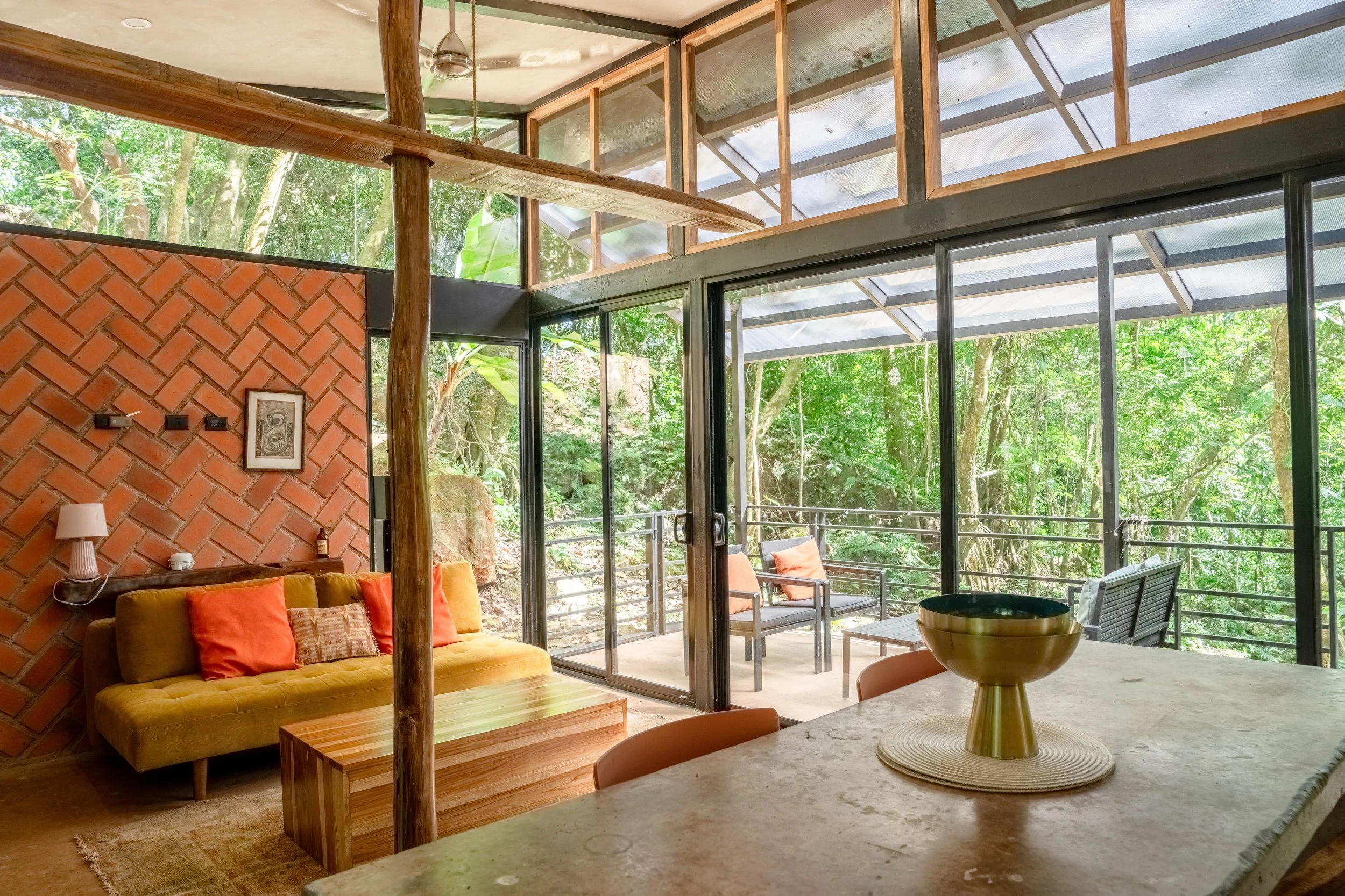 The main house features an open-plan living area with massive panoramic windows framing the rainforest canopy, a fully equipped kitchen, and a versatile central studio ideal for yoga or creative work. Both bedrooms feature A/C for nighttime comfort. Outside, a spacious jungle-facing terrace provides a front-row seat to regular sightings of monkeys and toucans, with a private trail leading directly to a secluded freshwater swimming creek.