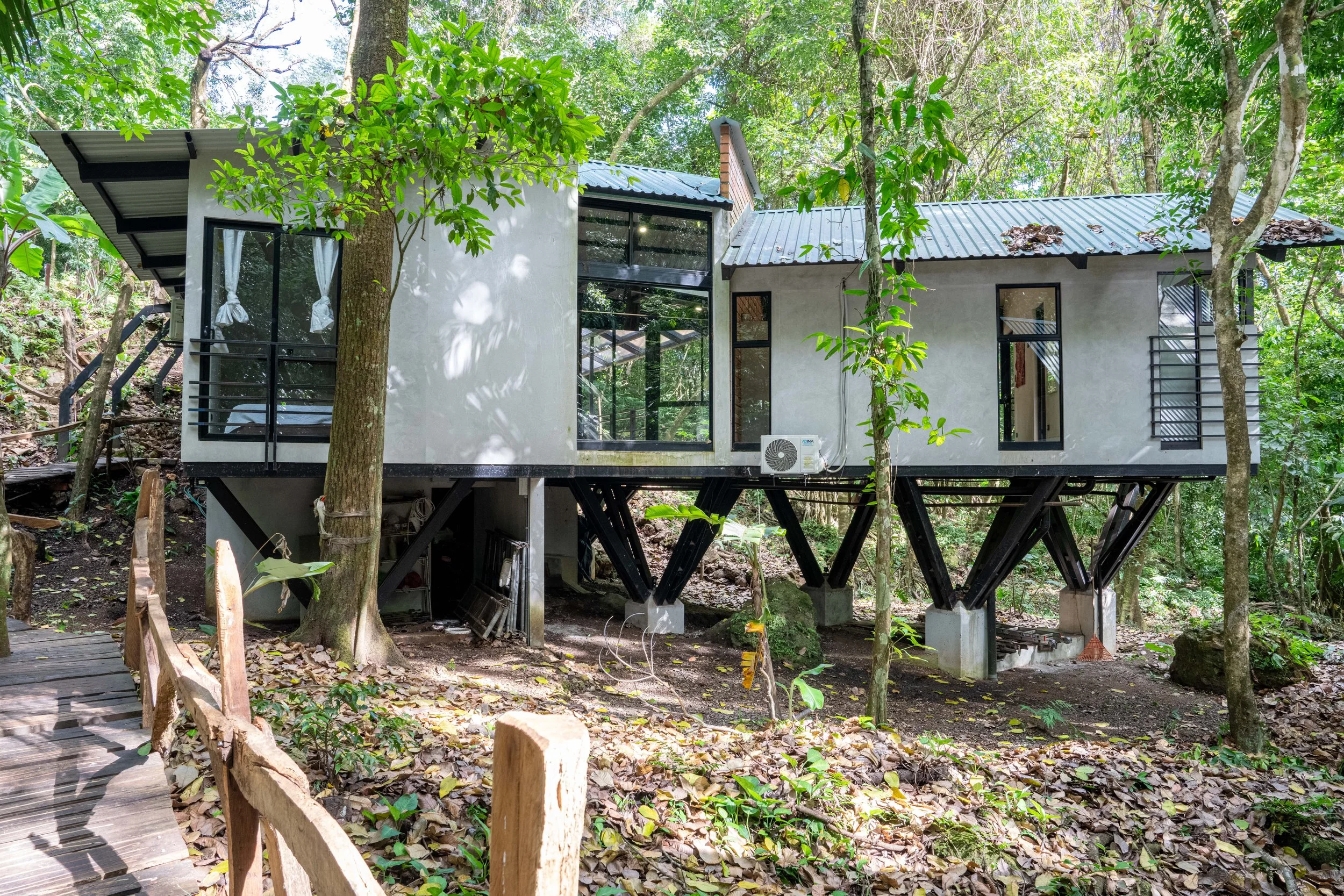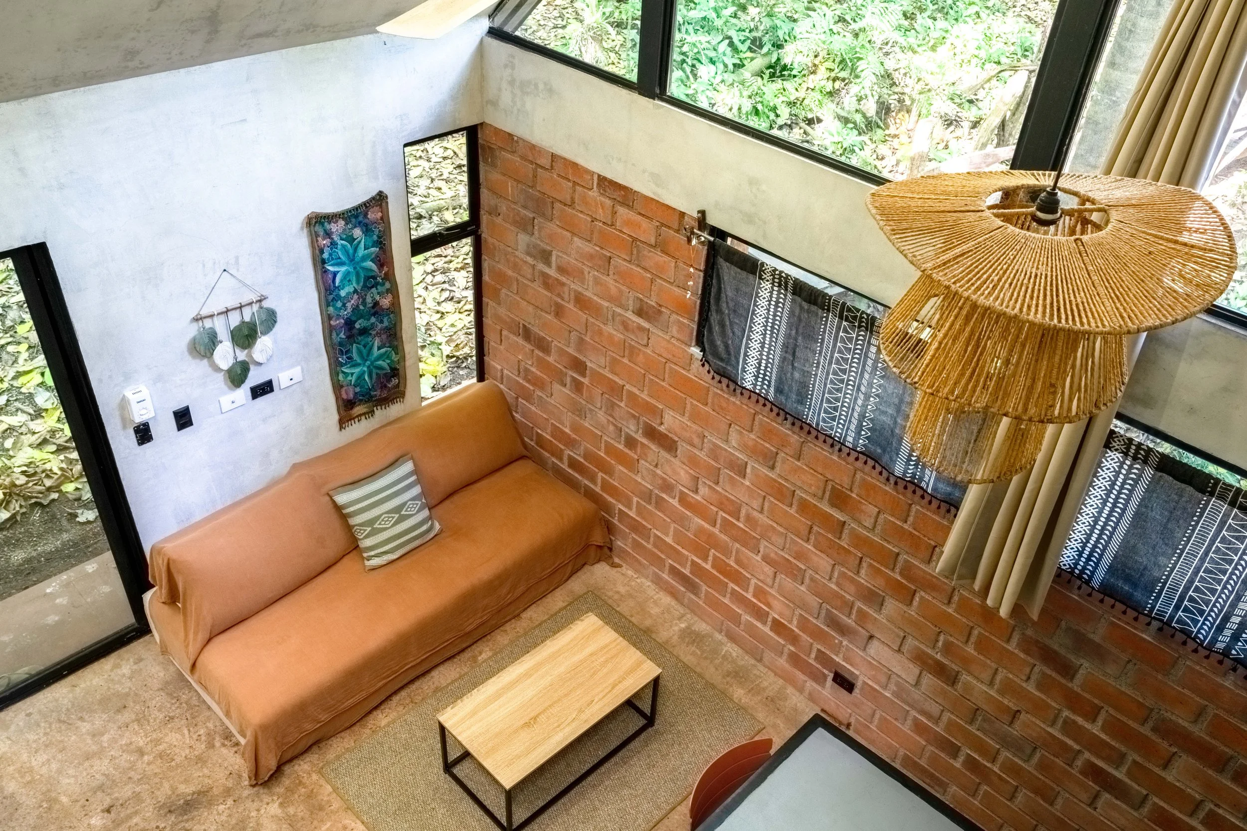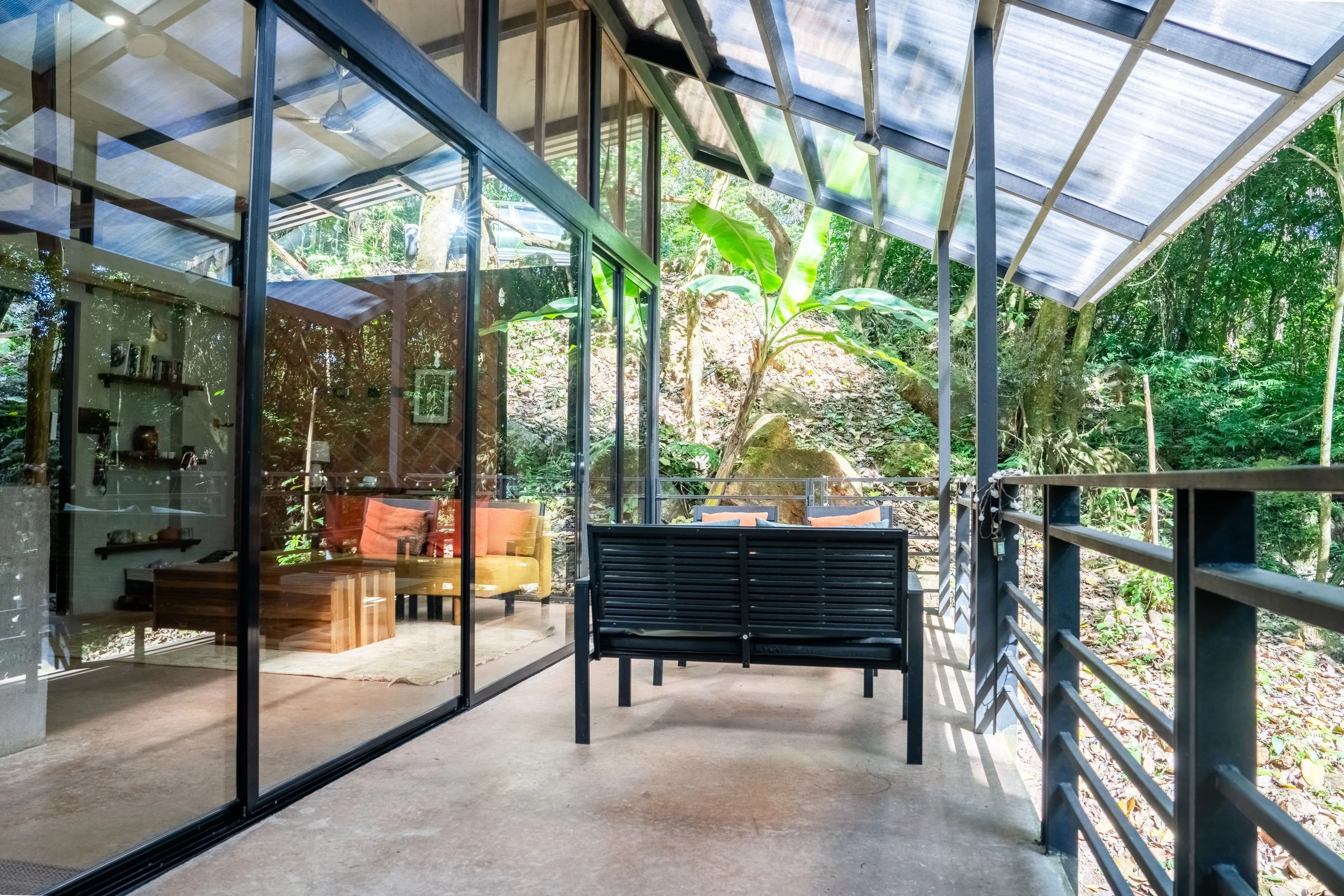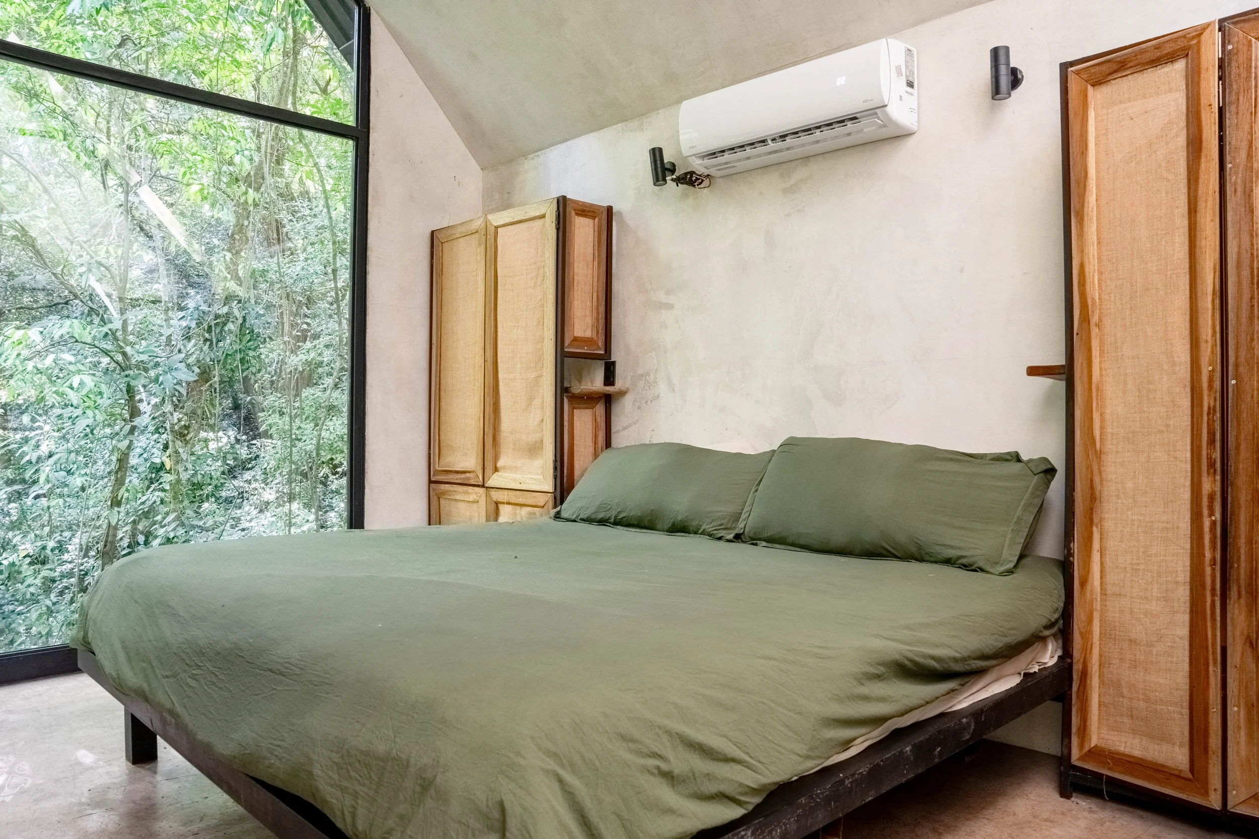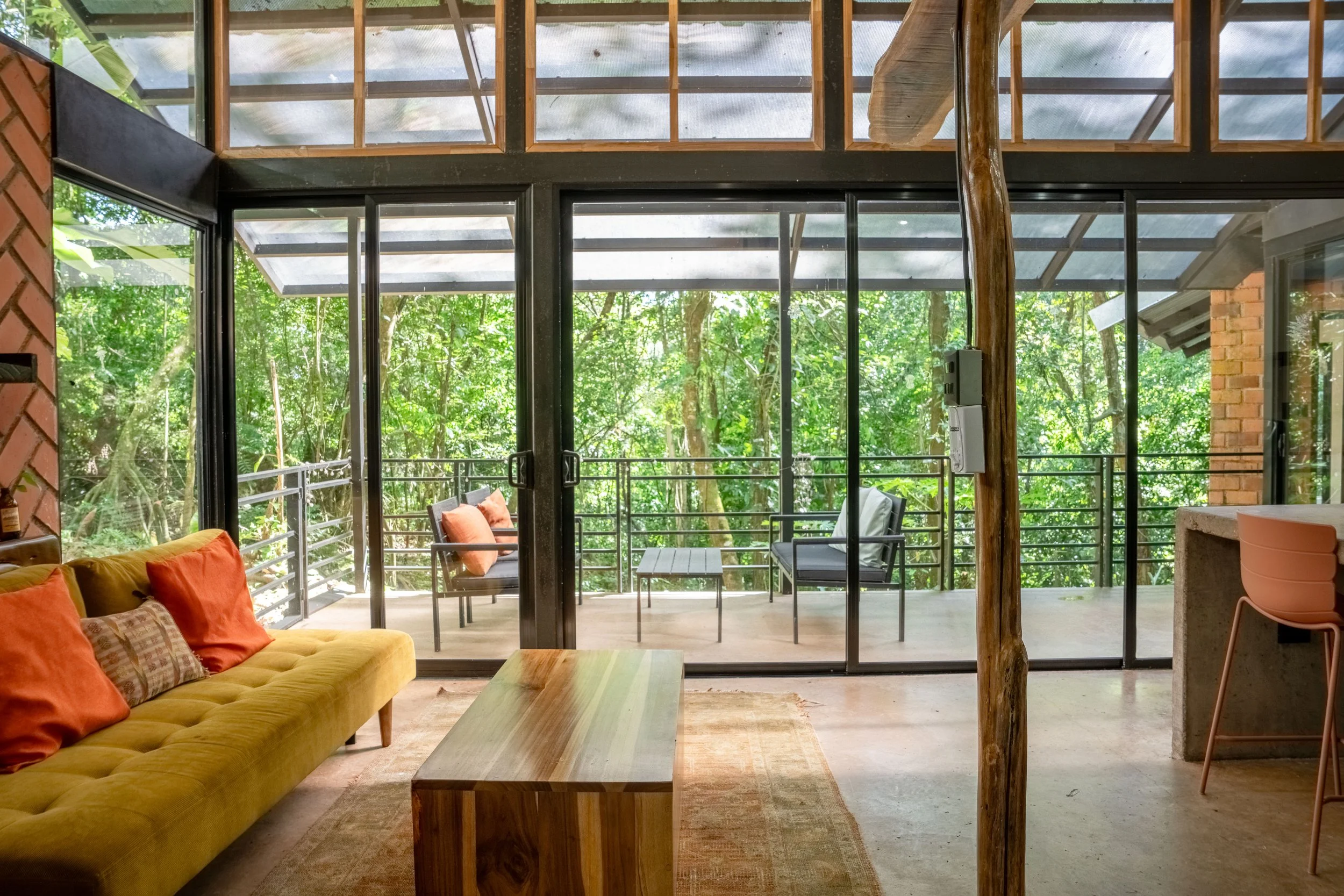 The main house features an open-plan living area with massive panoramic windows framing the rainforest canopy, a fully equipped kitchen, and a versatile central studio ideal for yoga or creative work. Both bedrooms feature A/C for nighttime comfort. Outside, a spacious jungle-facing terrace provides a front-row seat to regular sightings of monkeys and toucans, with a private trail leading directly to a secluded freshwater swimming creek.