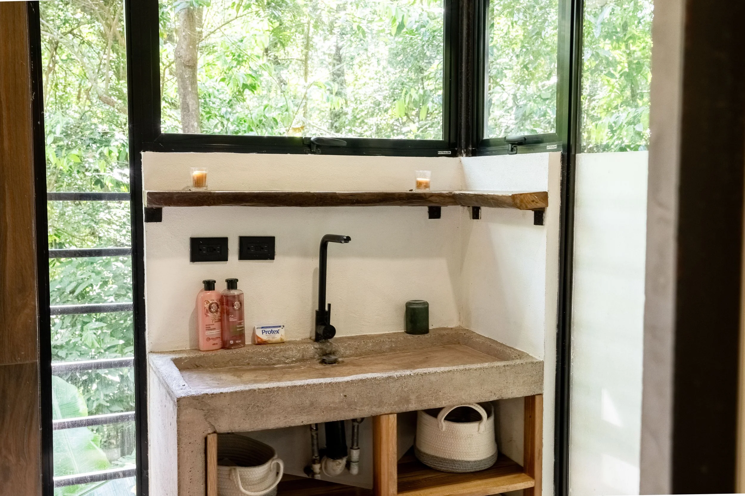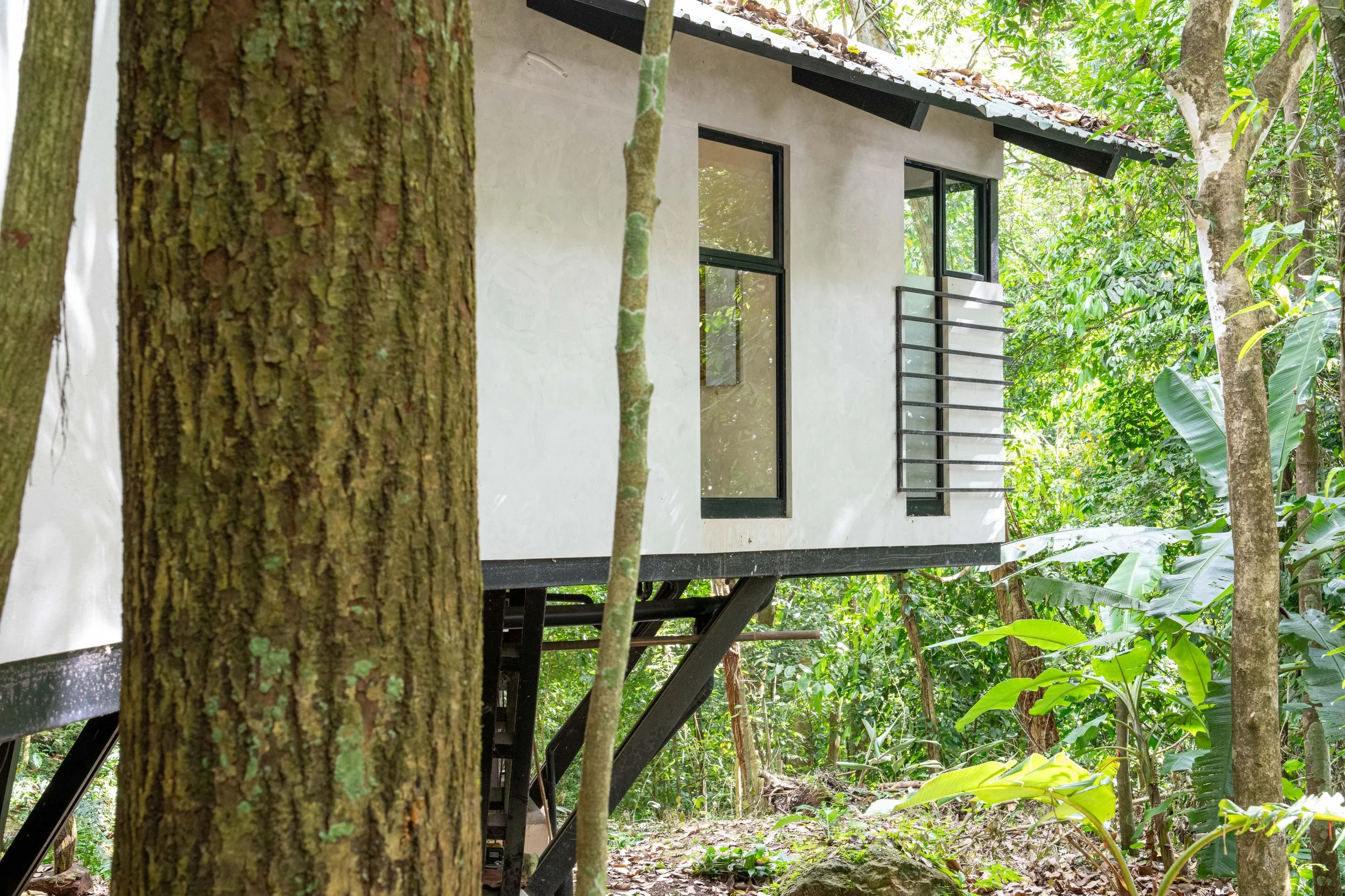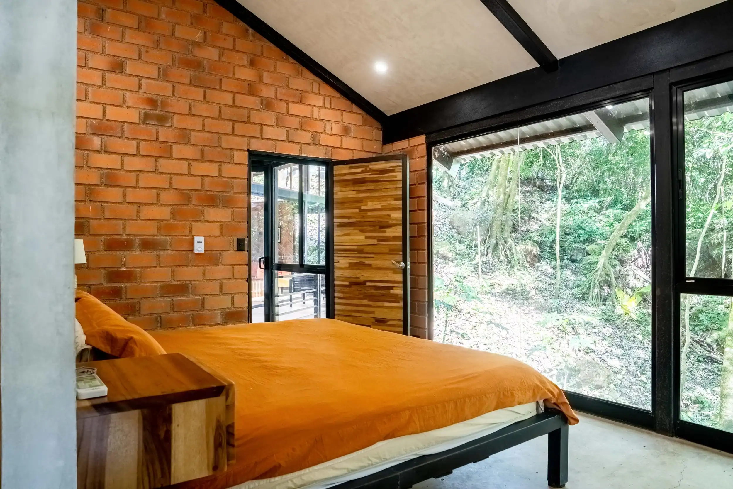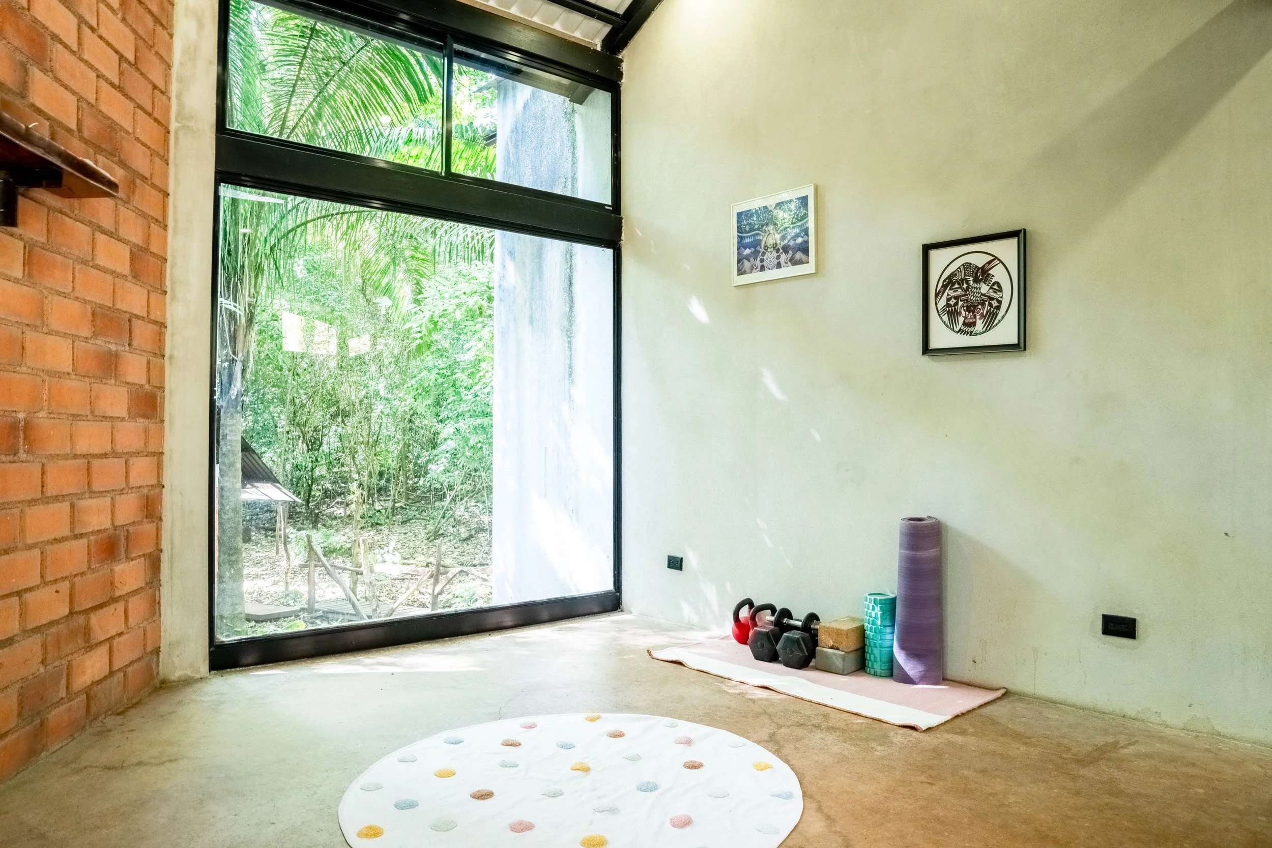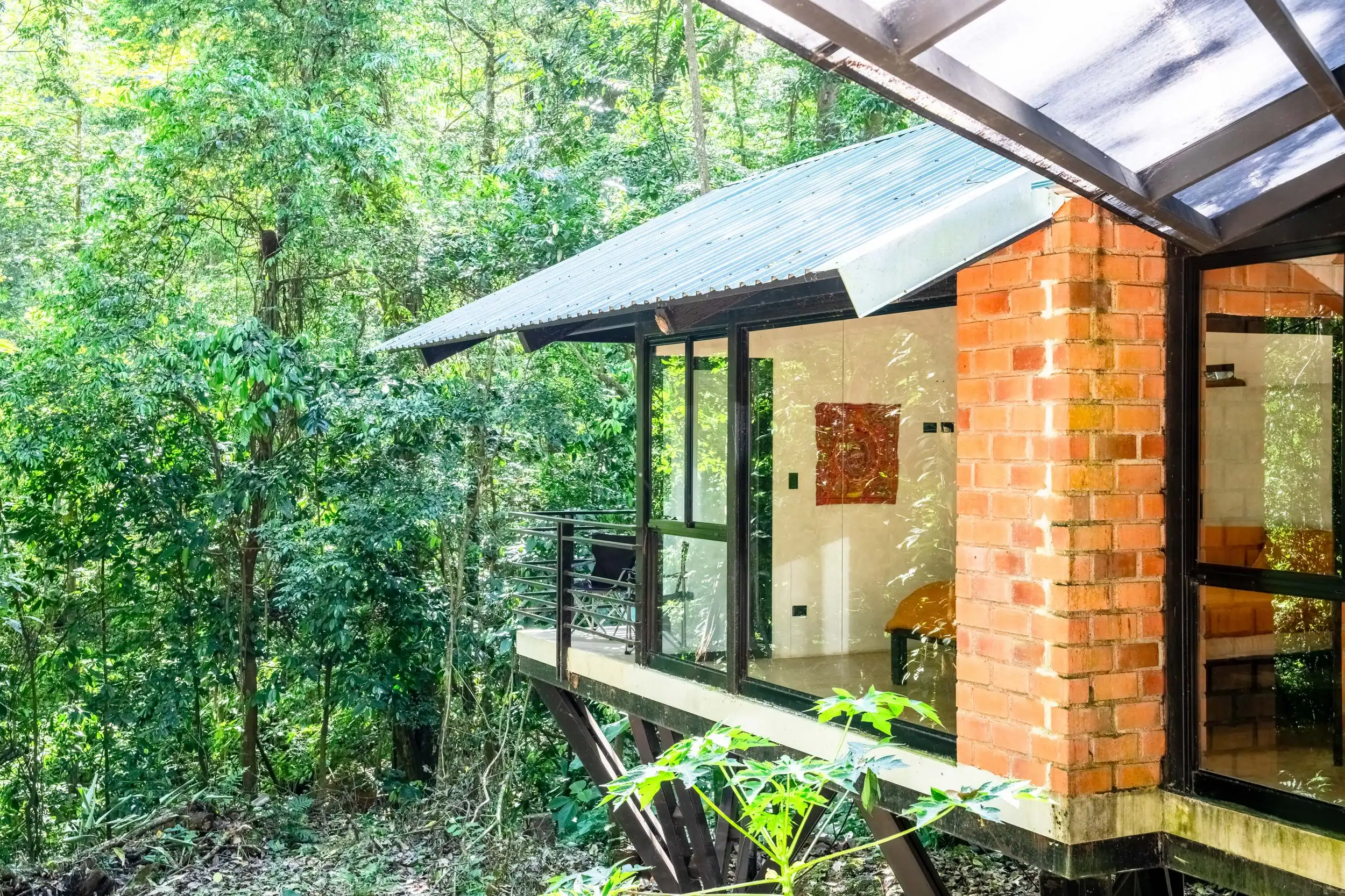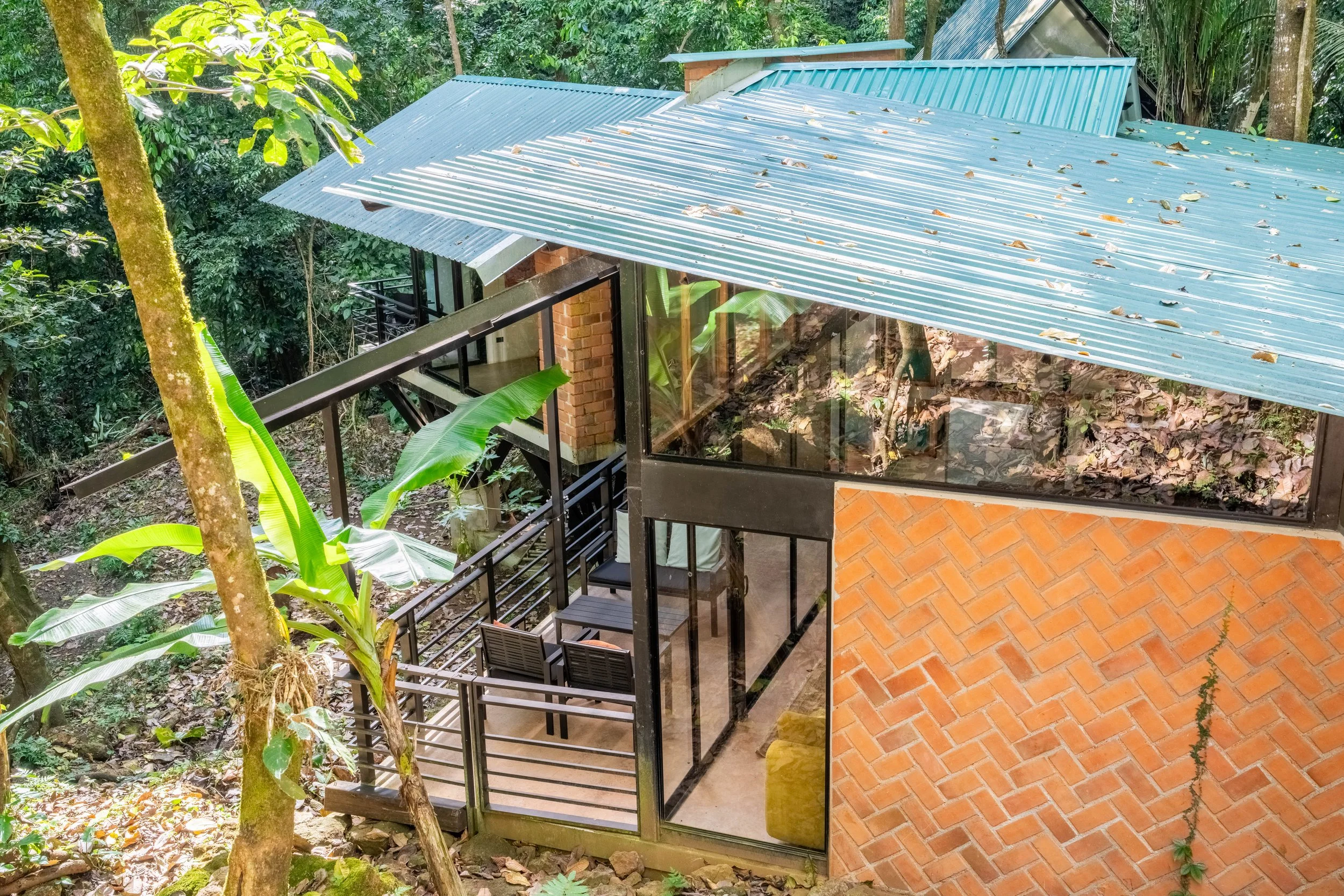 The main house features an open-plan living area with massive panoramic windows framing the rainforest canopy, a fully equipped kitchen, and a versatile central studio ideal for yoga or creative work. Both bedrooms feature A/C for nighttime comfort. Outside, a spacious jungle-facing terrace provides a front-row seat to regular sightings of monkeys and toucans, with a private trail leading directly to a secluded freshwater swimming creek.