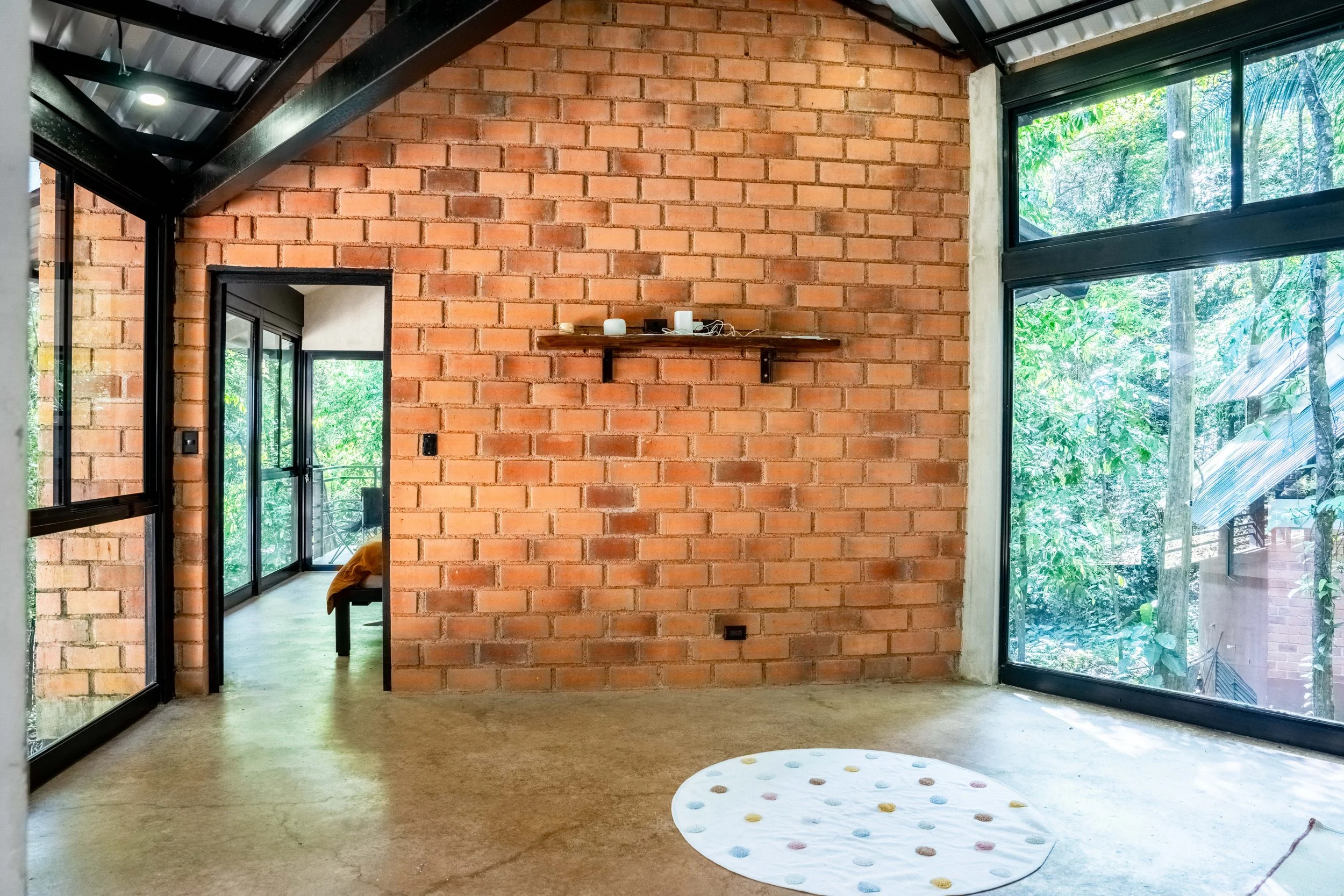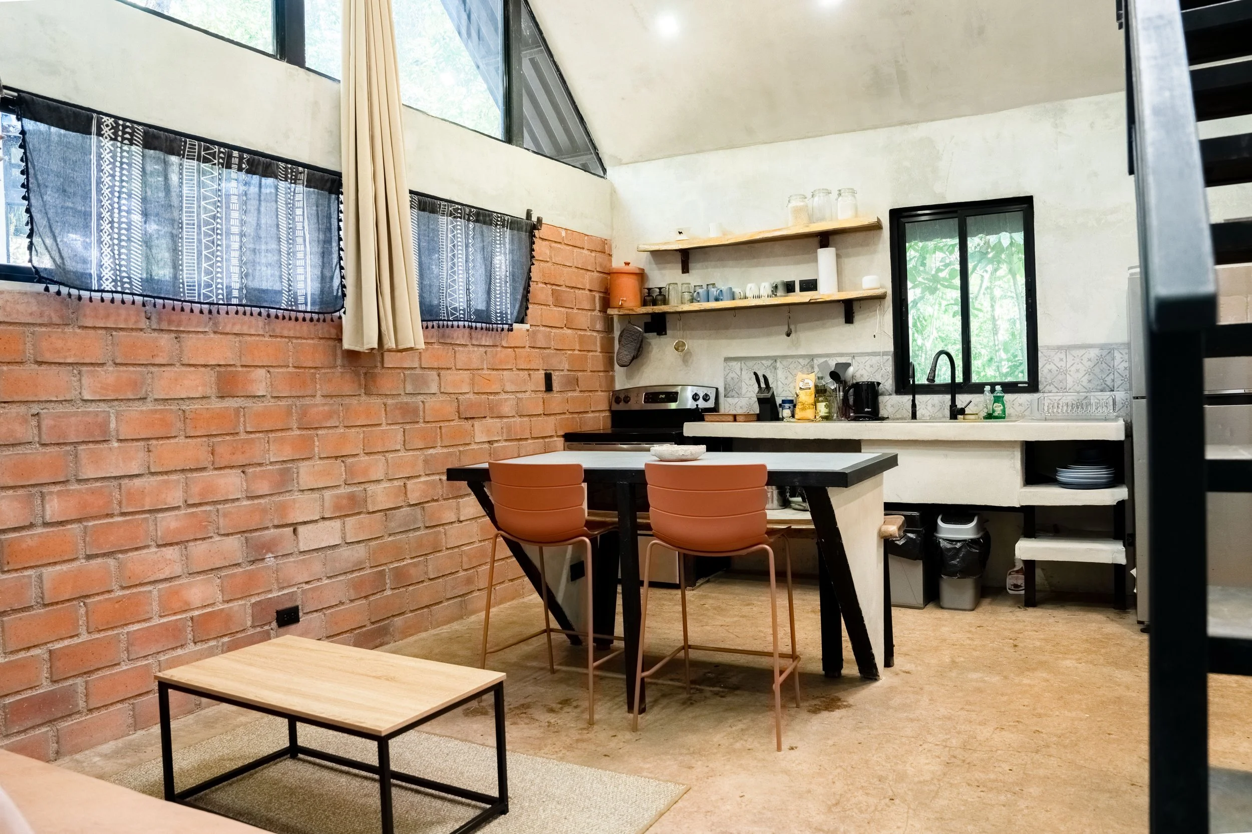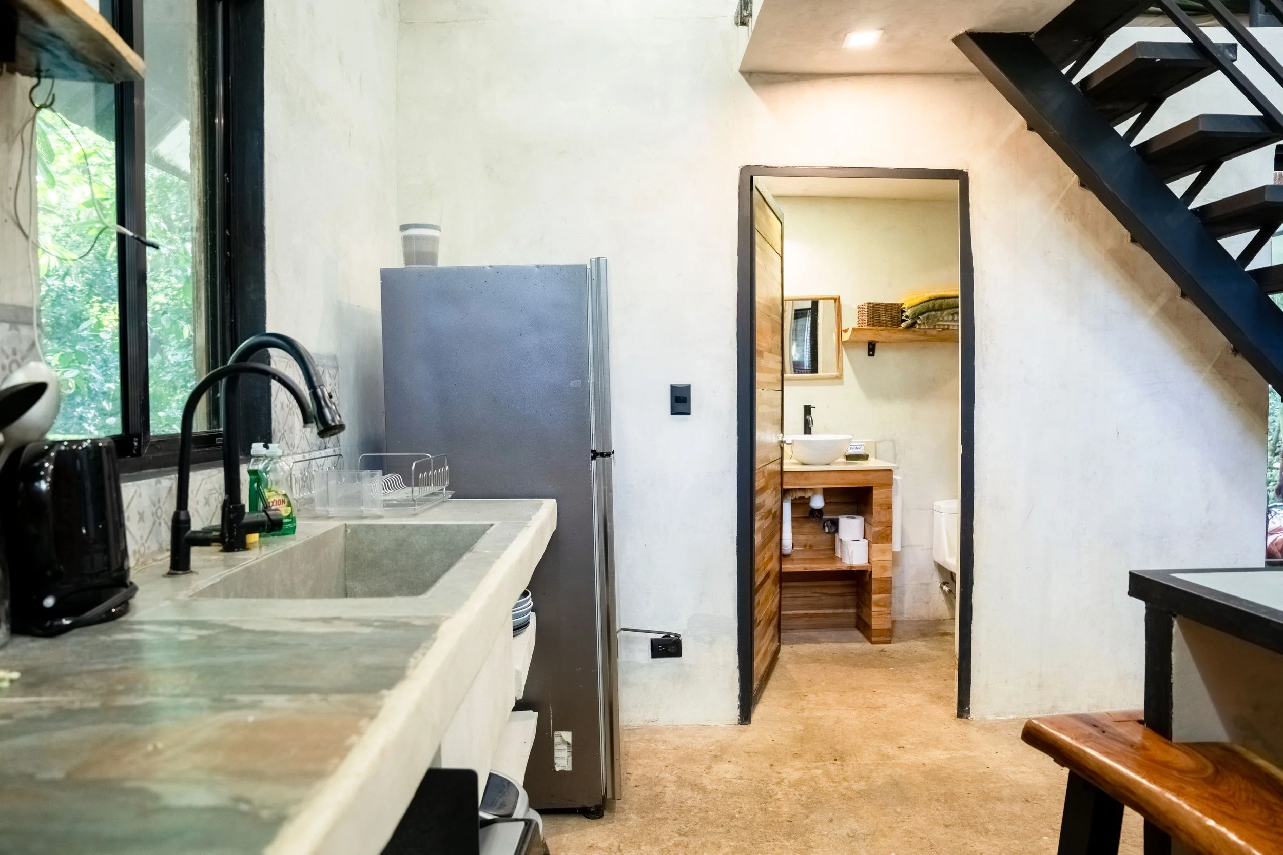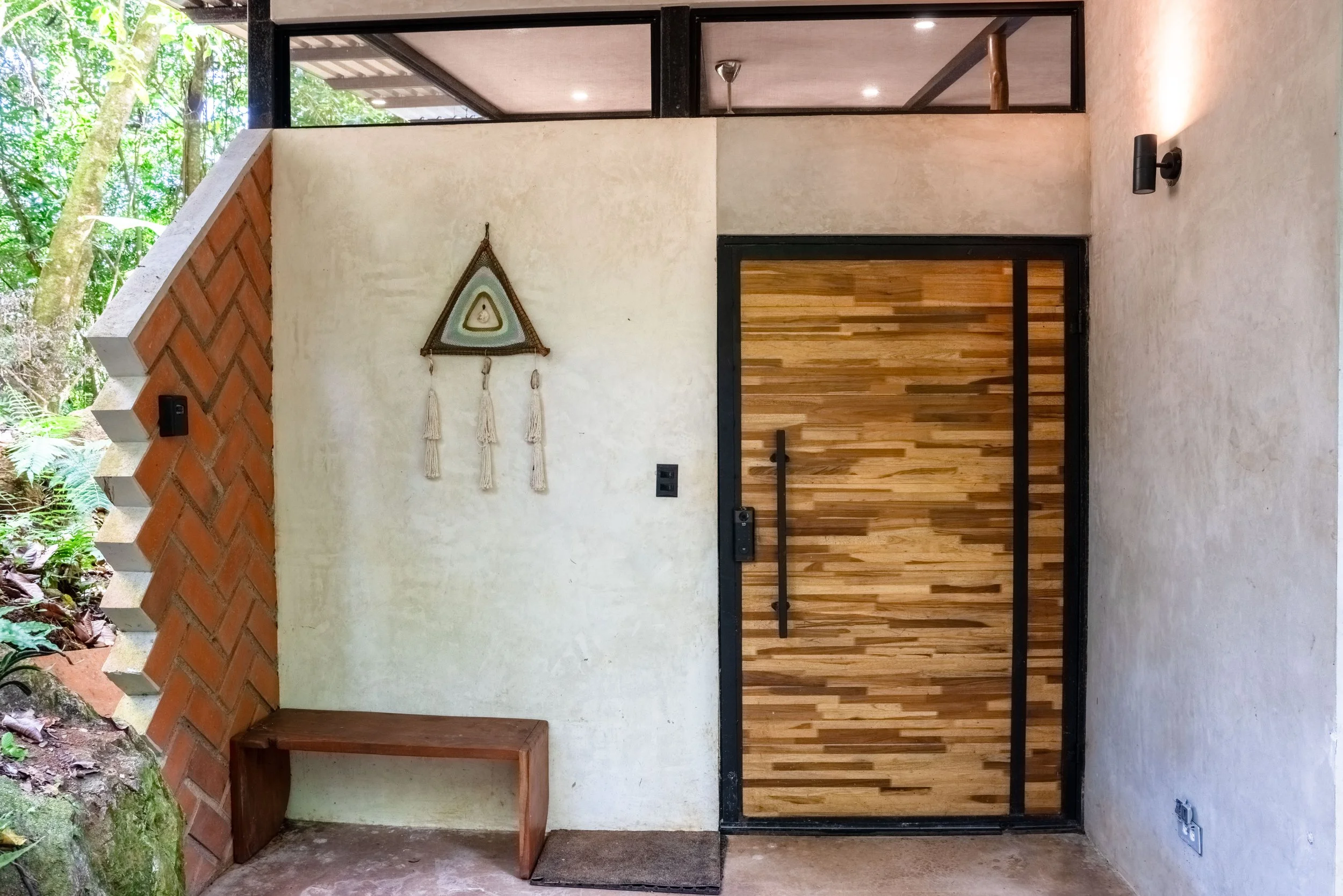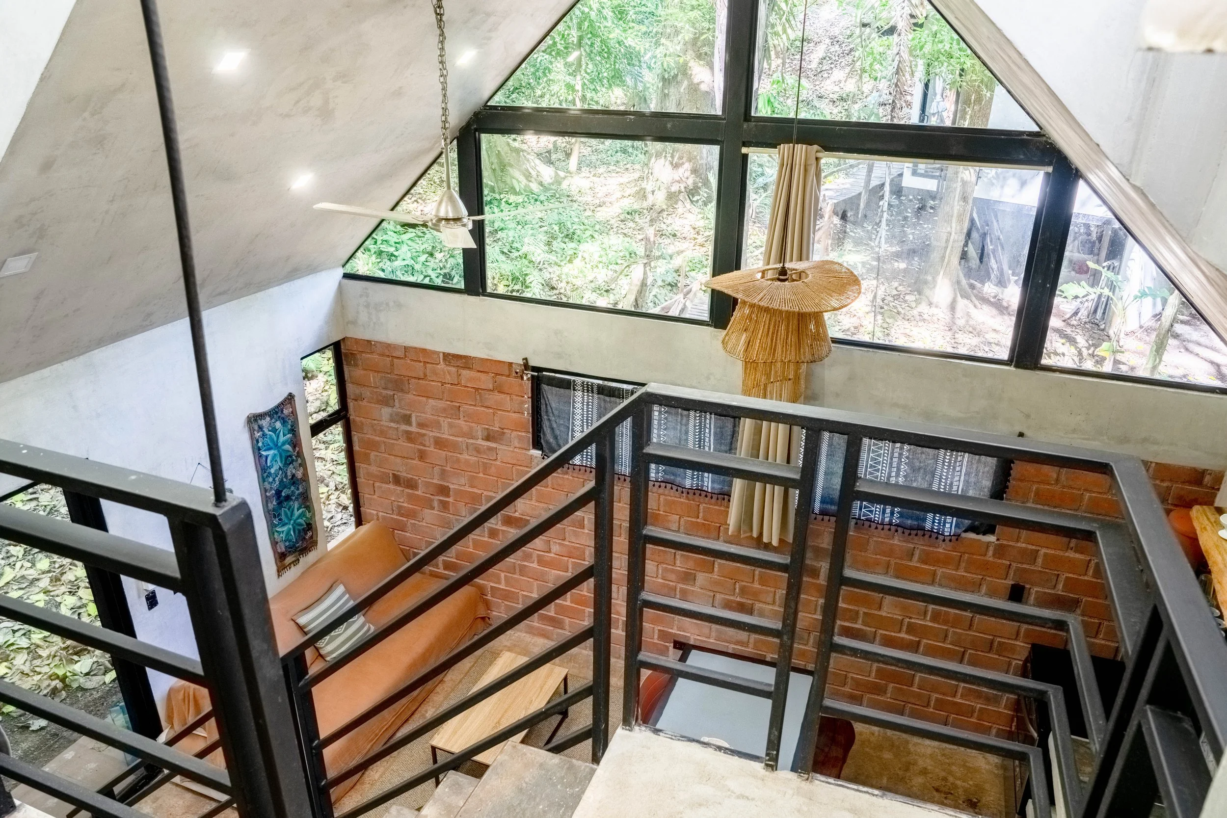 The main house features an open-plan living area with massive panoramic windows framing the rainforest canopy, a fully equipped kitchen, and a versatile central studio ideal for yoga or creative work. Both bedrooms feature A/C for nighttime comfort. Outside, a spacious jungle-facing terrace provides a front-row seat to regular sightings of monkeys and toucans, with a private trail leading directly to a secluded freshwater swimming creek.
