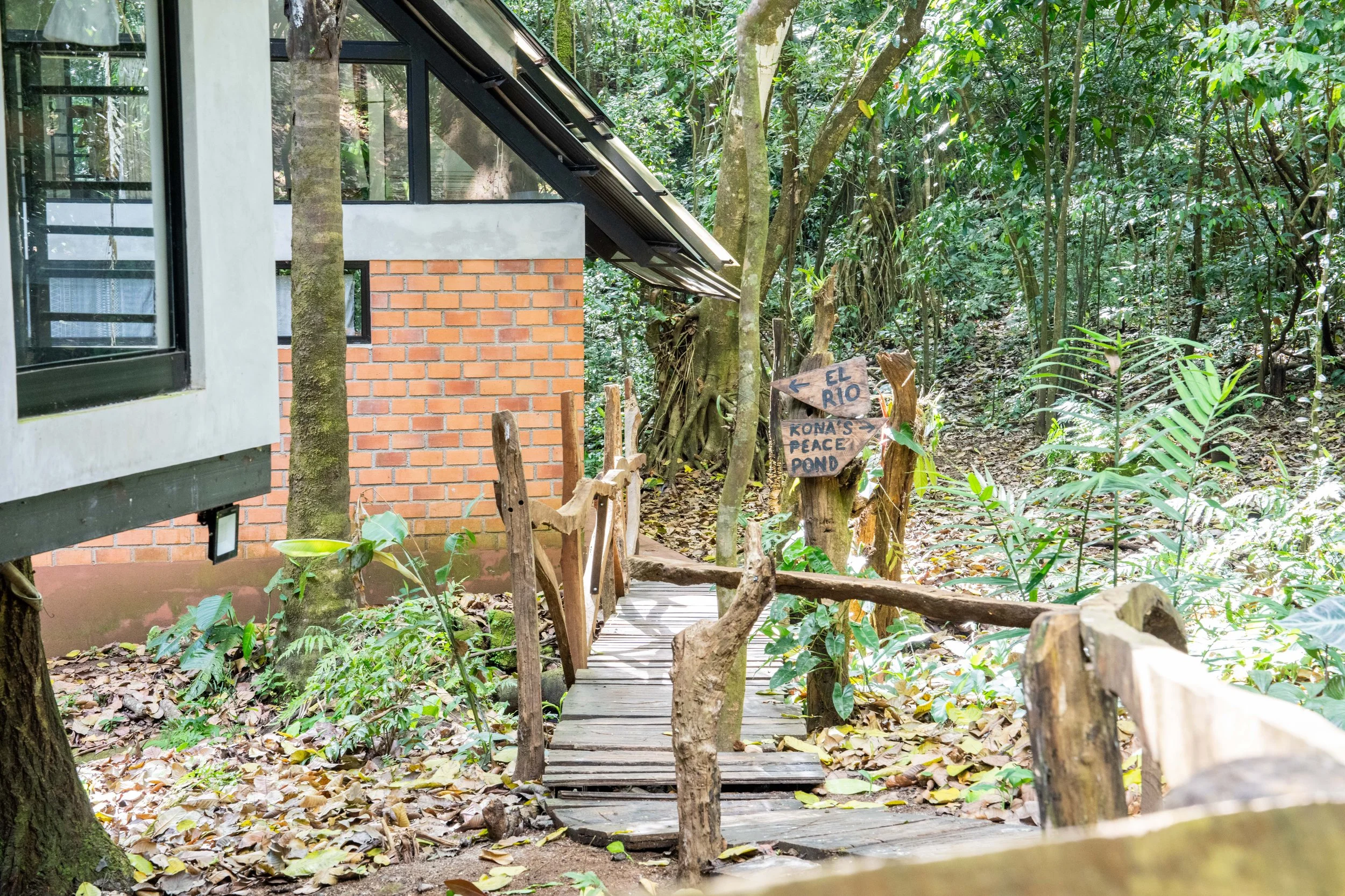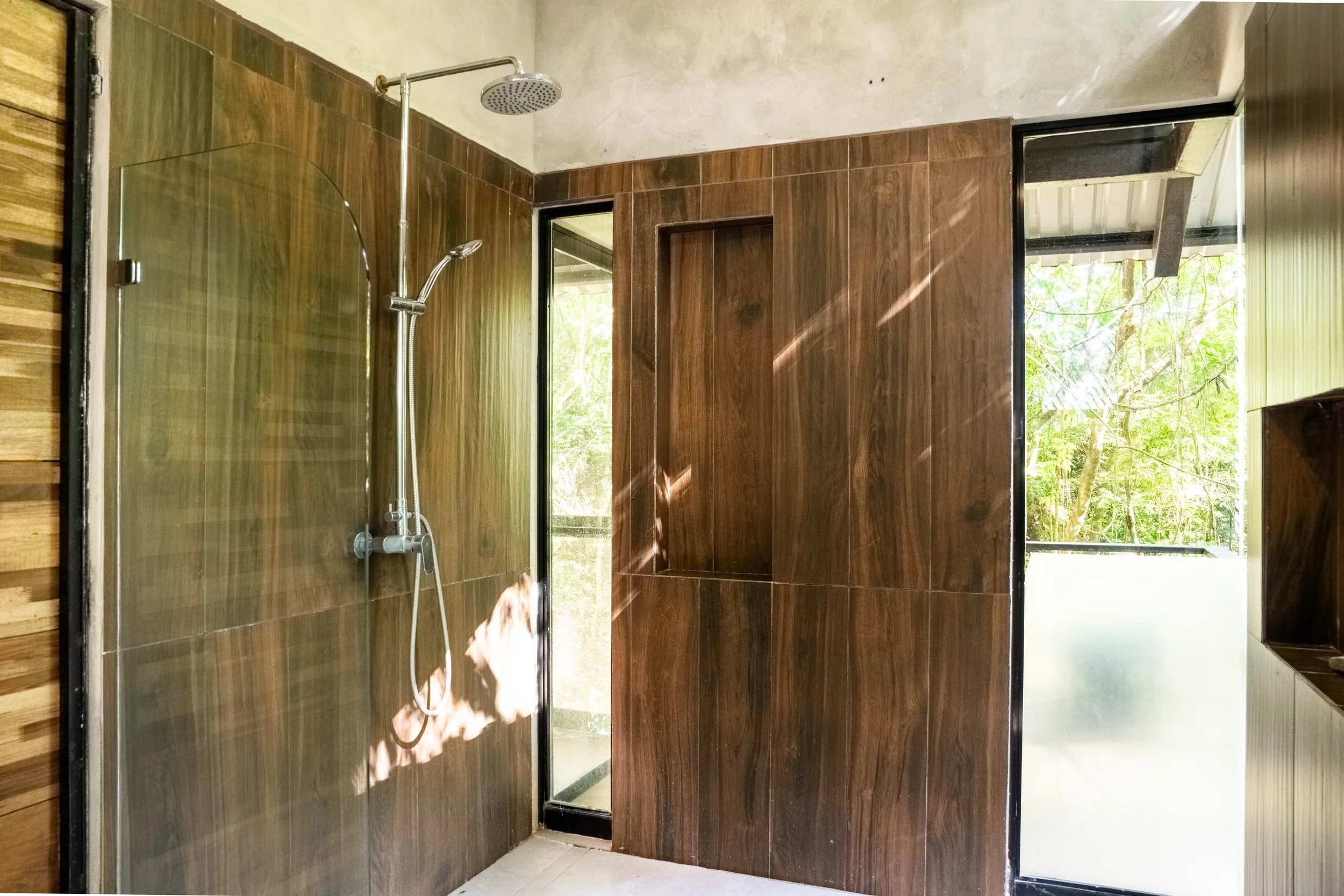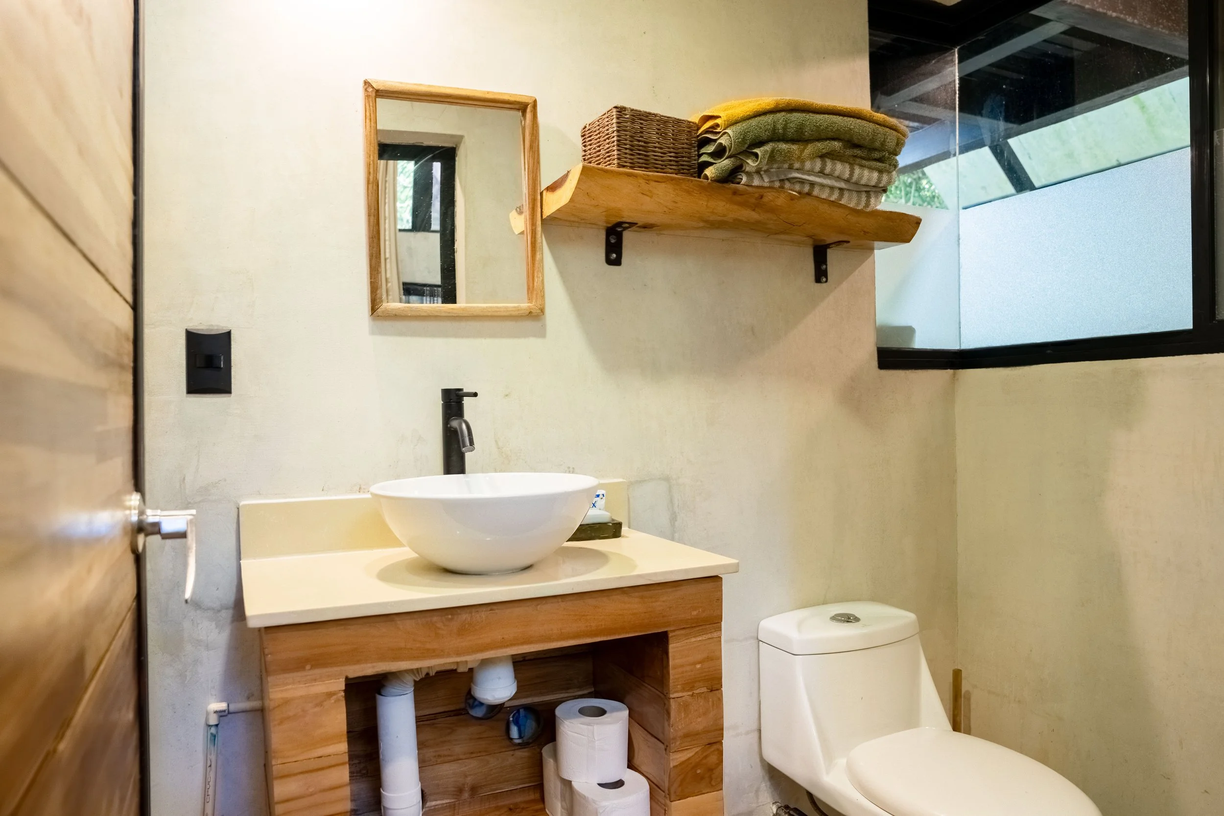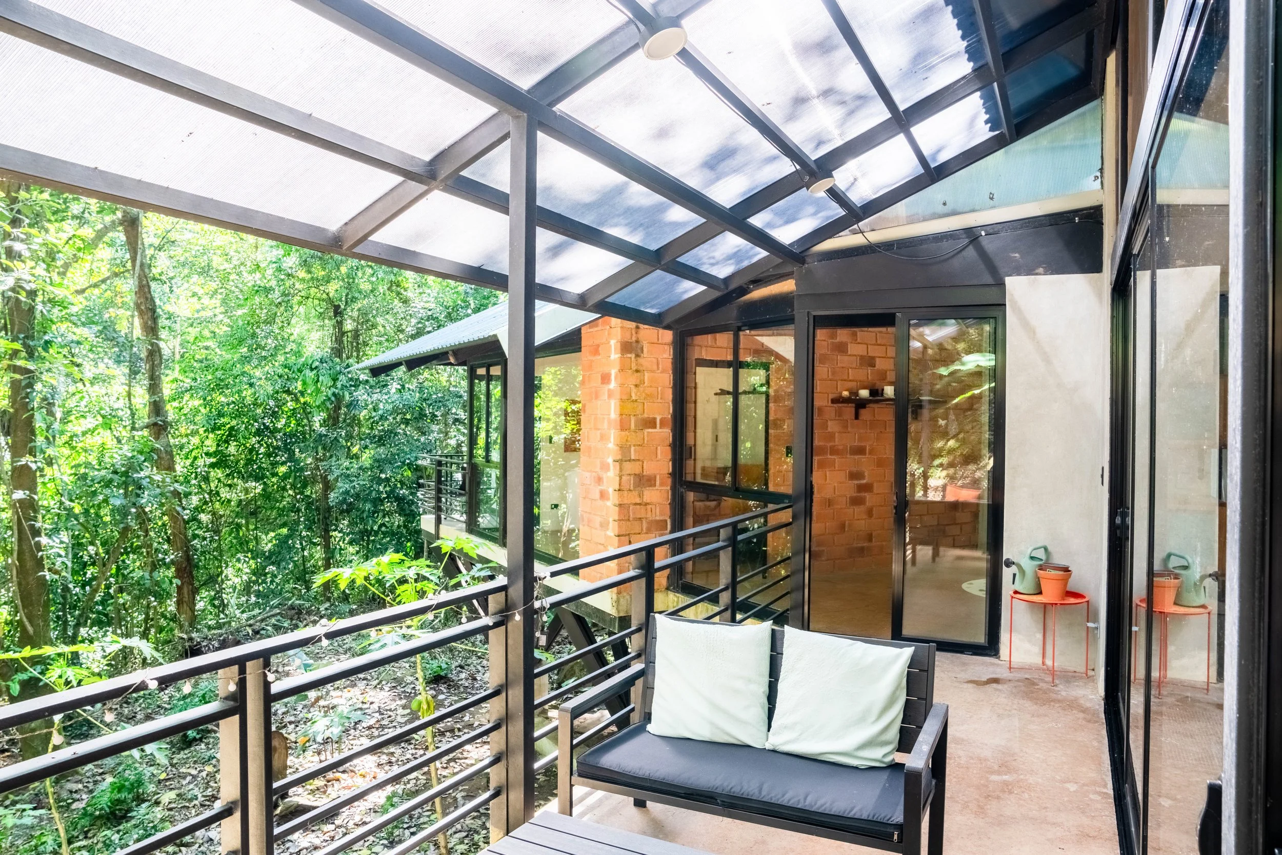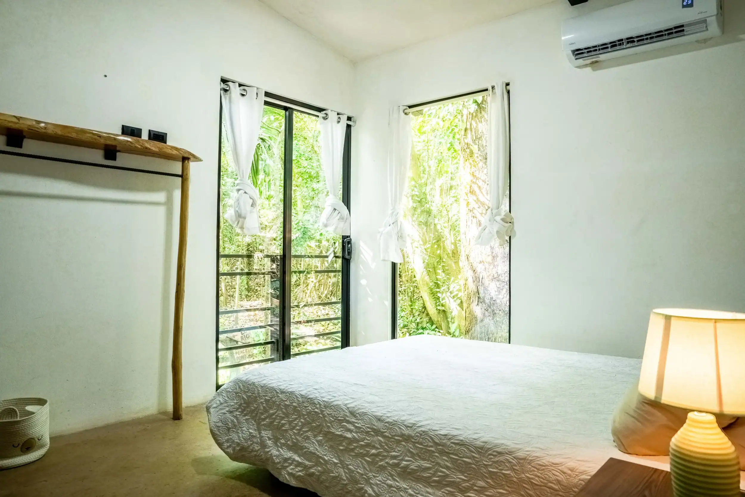 The main house features an open-plan living area with massive panoramic windows framing the rainforest canopy, a fully equipped kitchen, and a versatile central studio ideal for yoga or creative work. Both bedrooms feature A/C for nighttime comfort. Outside, a spacious jungle-facing terrace provides a front-row seat to regular sightings of monkeys and toucans, with a private trail leading directly to a secluded freshwater swimming creek.